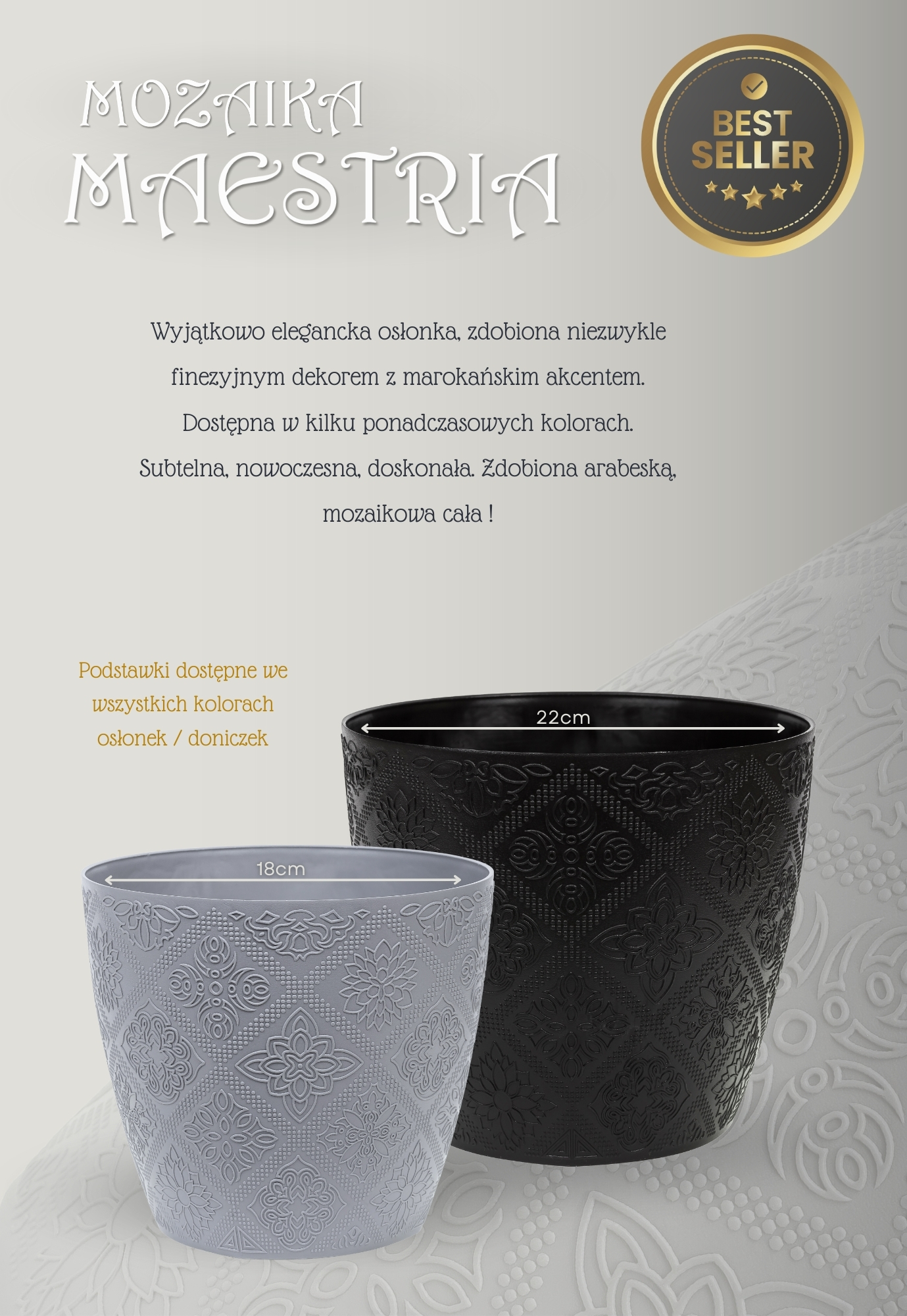 Ta wyjątkowa seria osłonek to propozycja dla osób, które szukają dodatków z „duszą”. Dzięki połączeniu wypukłego wzoru mozaikowego z klasyczną formą, doniczki te stają się centralnym punktem dekoracyjnym każdego pomieszczenia. Marokański akcent w postaci geometrycznych rombów i kwiatowych motywów nadaje im luksusowego charakteru, który pasuje zarówno do wnętrz typu glamour, jak i nowoczesnych apartamentów.